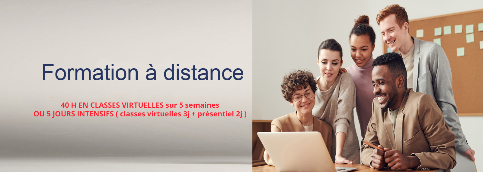 - 12 modules, 40 heures, en 5 semaines, incluant 17h en classes virtuelles, 3h en classes individuelles, 16h en apprentissage autonome (vidéos, PDF) et 4h en présentiel le jour de l’examen. Ou 33h e, 5 jours intensifs : 3 jours en classes virtuelles, suivis de 2 jours en présentiel).